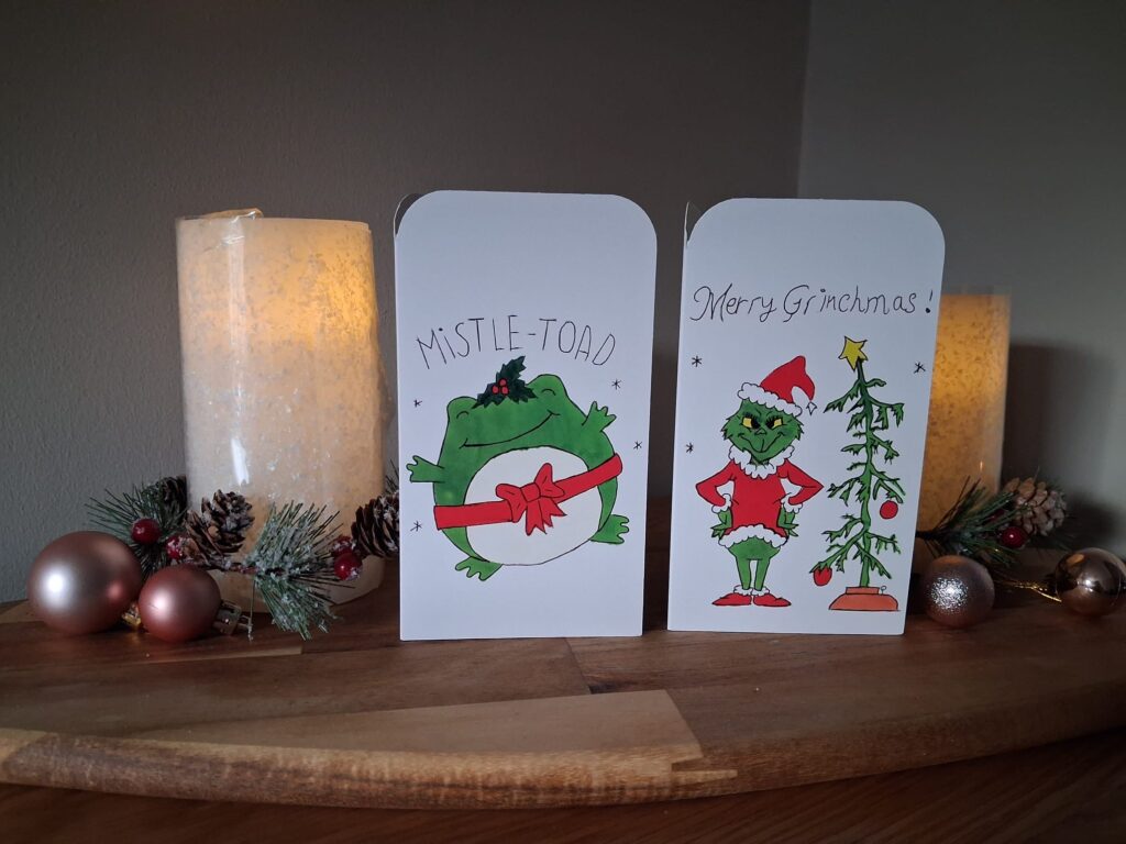 Charlotte has three designs for 2025: Mistletoad, Fa la la llama, and her best seller, the Grinch.